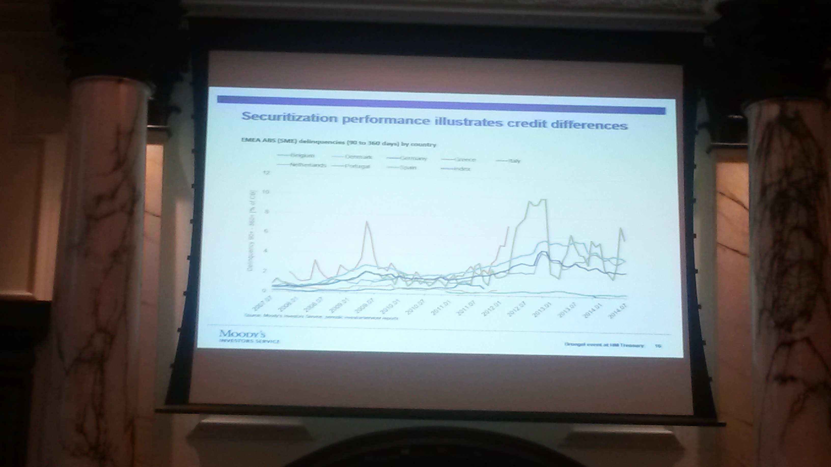 So can we have integrated capital markets with fragmented government bond markets? One of the panelists argued that securitisation performance across countries reflects credit differences between sovereigns (the graph below, in a rather bad photo, mea culpa). So much for reviving the European securitisation market.